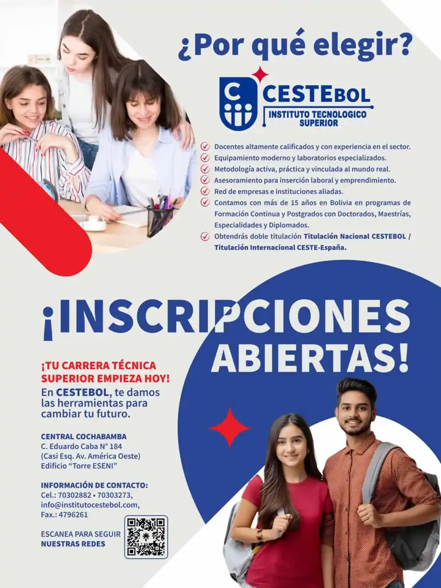 En CESTEBOL formamos técnicos líderes para el desarrollo del país. Somos una institución moderna con más de 15 años de formación continua en Doctorados, Maestria, Especialidades y Diplomados, orientada a brindar formación profesional integral y altamente conectada con el mercado laboral. Nuestra oferta está compuesta por carreras técnicas superiores que combinan teoría, práctica intensiva y tecnología aplicada. Nuestro modelo educativo impulsa el emprendimiento, la innovación y la ética profesional, permitiendo a los estudiantes destacarse desde el primer año. Creemos en el poder de la educación como motor de progreso individual y colectivo.